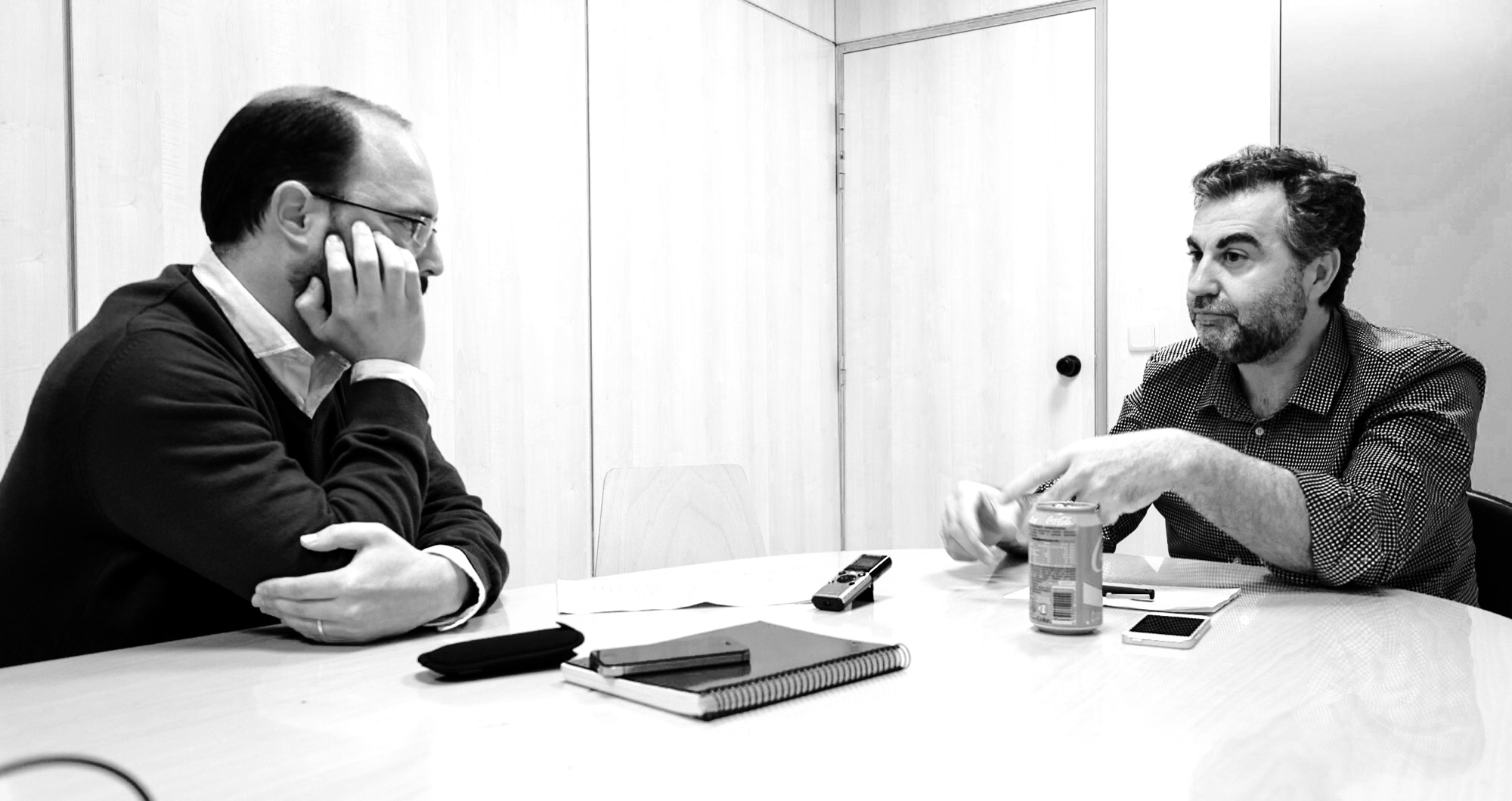 San Sebastián de los Reyes. A solas en una sala de reuniones. De fondo, Juan Ramón Lucas habla en directo. Alsina, yo, y una lata de Coca-Cola. Es relativamente temprano y día de fiesta nacional, pero él lleva ya bastantes horas despierto. Acaba de terminar su sesión en Más de uno y ahora está en modo balance.